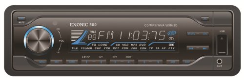 Flip-Down WMA / MP3, CD Receiver with USB, SD / MMC. CD / MP3 / WMA / CD-R / CD-RW Compatible. Integrated USB Port. Integrated SD / MMC Card Slot. Front AUX Input. Flip-Down and Detachable Face. iPod Ready. MP3 File and Folder Search by Name. MP3 Track and MP3 Character Search. MP3 ID3 TAG (Song / Album / Artist Title) Display. Volume / Bass / Treble / Balance / Fader control. DSP Sound Effect (Pop / Flat / Classic / Rock). Auto Memory Store. AM / FM Radio Tuner. 30 Preset Stations (18 FM / 12 AM). MOSFET 50W x 4 Audio Output. 4 channels x 4V Line-Out. 4V Subwoofer Output. Multi Function Remote ControlExonic 500 Flip-Down WMA/MP3/CD Detachable Receiver with USB, SD/MMC and Remote Specifications
